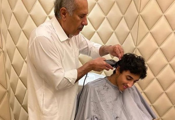 وعبر موقع (إنستغرام) فقد ظهر الشيخ بن جاسم، خلال الصورة، وهو يحلق شعر ابنه أثناء وجودهما في العزل المنزلي، الذي تسبب به فيروس (كورونا).