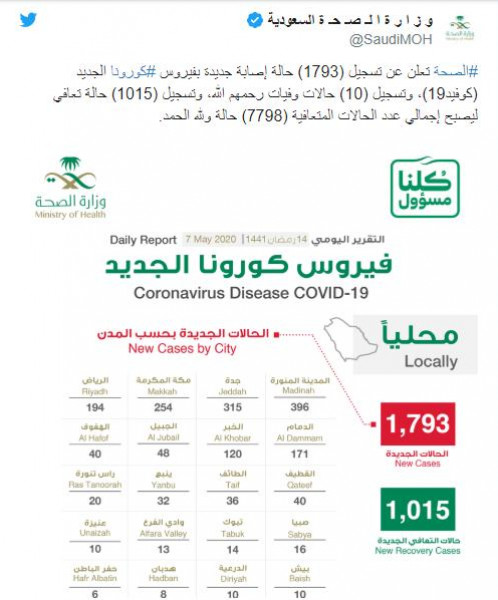 سجلت المملكة العربية السعودية، اليوم الخميس، ارتفاعا قياسيا جديدا بإصابات فيروس (كورونا) وهي 1793 حالة خلال الساعات الـ24 الماضية.