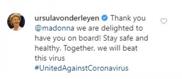 بدورها، علقت أورسولا فون دير لاين، رئيسة المفوضية الأوروبية، على تدوينه مادونا التى كانت مرفقة بصورة من عنوان خبر يشير لتعاون النجمة العالمية فى اجتماع دعم تمويل لقاح فيروس كورونا الذى حصد 8 مليارات دولار، وقالت رئيسة المفوضية الأوروبية "شكرا لك مادونا يسعدنا انضمامك إلينا.. حافظى على سلامتك وصحتك.. معا نتغلب على هذا الفيروس.. متحدون ضد فيروس كورونا".