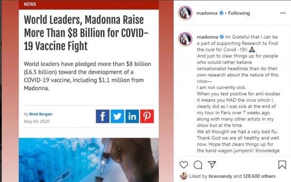 وكانت قد قالت نجمة الغناء والاستعراض الأمريكية مادونا، إن لديها أجساما مضادة ضد فيروس كورونا المستجد فى الدم، قائلة إنها تعتزم الخروج من البيت لأجل ما وصفته بـ"التنفس فى هواء كوفيد 19".
