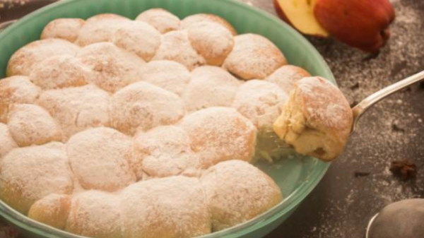 تقطع العجينة إلى كور صغيرة متساوية ثم تحشى كل كرة بمقدار ملعقة كبيرة من حشوة التفاح.