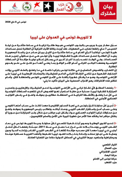 أصدرت 6 أحزاب تونسية، بياناً مشتركاً، بعنوان (لا لتوريط تونس في العدوان على ليبيا) عبروا فيه عن رفضهم المُطلق لأي نشاط تركي على الأراضي التونسية لدعم المليشيات والإرهابيين وتصدير المرتزقة لليبيا.