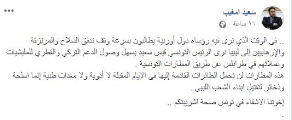 وفي منشور عبر حسابه بموقع (فيسبوك) علق امغيب على إعلان الرئاسة التونسية، أنها سمحت لطائرة تركية، تنقل مساعدات طبية لحكومة الوفاق بالهبوط في أحد مطاراتها، بشرط تولي السلطات التونسية عمليتي الاستلام والتسليم، بالقول إن الطائرات القادمة إلى المطارات التونسية، لن تحمل "في الأيام المقبلة لا أدوية ولا معدات طبية، إنما أسلحة وذخائر لقتل أبناء الشعب الليبي".