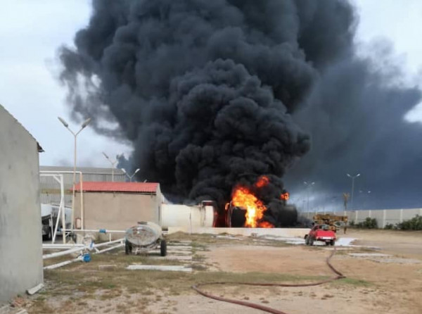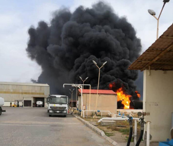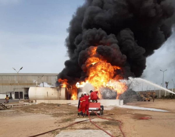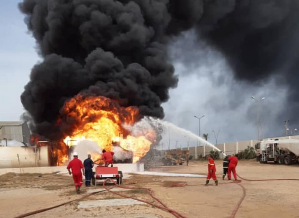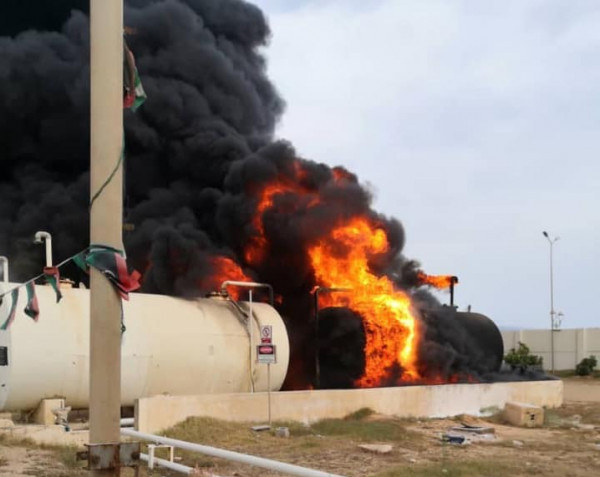 وقالت المؤسسة "إصابة حظيرة خزانات وقود الطيران التابعة لشركة البريقة لتسويق النفط، بمستودع مطار معيتيقة الدولي، وجاري التعامل مع الحرائق من قبل رجال الإطفاء الشجعان"، بحسب ما جاء على موقع (روسيا اليوم).