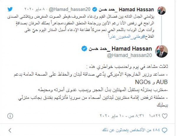 وغرد وزير الصحة العامة في لبنان، الدكتور حمد حسن على (تويتر) فجر اليوم الأحد قائلا: "3 مشاهد في يوم واحد سبب خواطري: مساعد وزير الخارجية الأمريكي يدعي صداقة لبنان والحفاظ على الصحة العامة بدعم (الجامعة الأمريكية في لبنان) AUB و NGOs (الأمريكية أيضا).