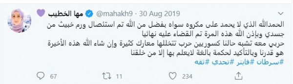 وأعلنت مها إصابتها بالسرطان العام الماضي، عبر منشور على تويتر كتبت فيه: "الحمدالله الذي لا يحمد على مكروه سواه بفضل من الله تم استئصال ورم خبيث من جسدي وبإذن الله هذه المرة تم القضاء عليه نهائيا حربي معه تشبه حالنا كسوريين حرب تتخللها معارك كثيرة وإن شاء الله هذه الأخيرة هو قدرنا وبالتأكيد لحكمة بالغة لايعلم بها إلا من خلقنا".