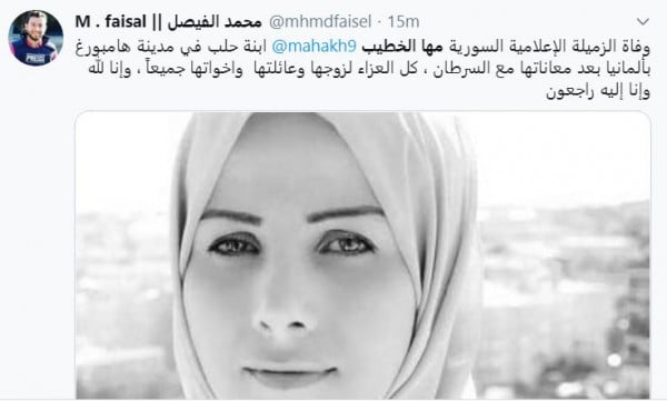 ونعى عدة صحافيين زميلتهم مها، فكتب محمد الفيصل: "وفاة الزميلة الإعلامية السورية مها الخطيب ابنة حلب في مدينة هامبورغ بألمانيا بعد معاناتها مع السرطان ، كل العزاء لزوجها وعائلتها واخواتها جميعاً ، وإنا لله وإنا إليه راجعون".