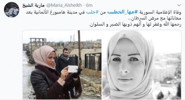 وكتبت الإعلامية ديما السيد: "الإعلامية السورية مها الخطيب في ذمة الله، الرحمة لروحها والعزاء لعائلتها ومحبيها".