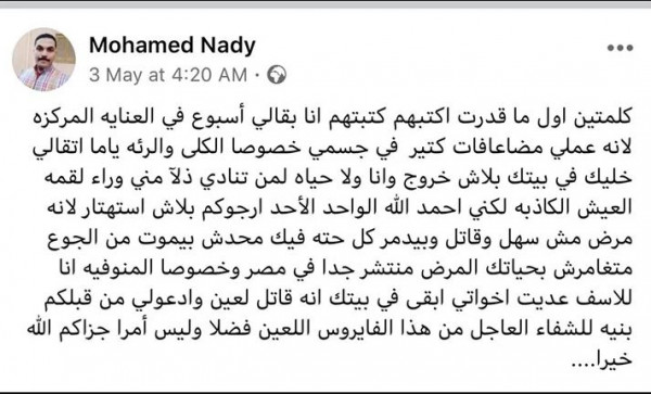 وتابع: "ياما اتقالي خليك في بيتك بلاش خروج وأنا ولا حياة لمن تنادي ذلا مني وراء لقمة العيش الكاذبة.. أرجوكم بلاش استهتار لأنه مرض مش سهل وقاتل وبيدمر كل حته فيك، محدش بيموت من الجوع متغامرش بحياتك، المرض منتشر جدا".
