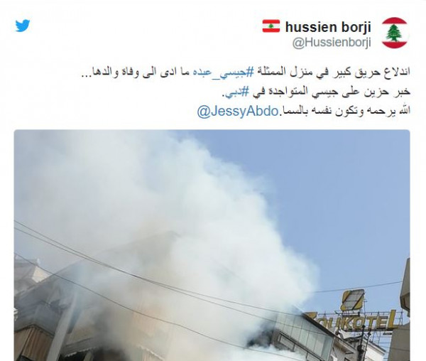 ونشر الصحفي اللبناني حسين برجي الخبر عبر صفحته على "تويتر"، مُرفقاً إياه بصورة من موقع الحريق وعلق: "اندلاع حريق كبير في منزل الممثلة #جيسي_عبدو ما أدى إلى وفاة والدها… خبر حزين على جيسي المتواجدة في #دبي.. الله يرحمه وتكون نفسه بالسما".