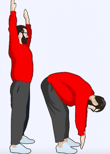 اتخذ وضعية الوقوف وارفع ذراعيك بشكل متوازٍ إلى الأعلى، ومن ثم قم بالانحناء إلى الأمام حتى تلامس يديك قدميك. عد إلى الوضع السابق، ثم كرر التمرين لمدة 5 دقائق.
