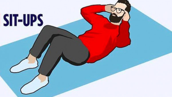 اتخذ وضعية الاستلقاء، ويديك تحت رأسك، ثم قم بثني ركبتيك. قم بالنهوض بالقسم الأعلى من جسمك مع حتى يلامس صدرك ركبتيك. كرر التمرين لمدة دقيقتين.