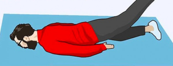 استلق على بطنك، وضع يديك تحت فخذيك. ارفع إحدى ساقيك ورأسك في نفس الوقت، ومن ثم اخفضهما. كرر التمرين بالساق الأخرى بالتناوب.