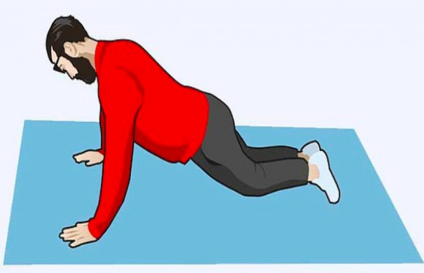 اتخذ وضعية الاستناد على يديك وقدميك مع رفع ركبتيك إلى الأعلى، ومن ثم ابدأ بممارسة تمرين الضغط. كرر التمرين لمدة دقيقتين.