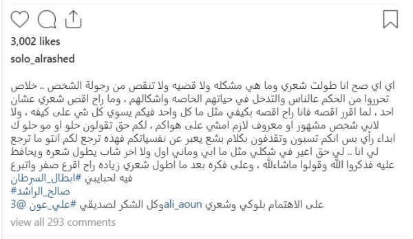 ونشر الراشد الفيديو عبر حسابه على "إنستجرام" مُعلقاً: "صح أنا طولت شعري وما هي مشكلة ولا قضية ولا تنقص من رجولة الشخص، خلاص تحرروا من الحكم على الناس والتدخل في حياتهم الخاصة وأشكالهم".