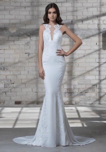 ولتحصل العروس على إطلالة محتشمة وتكتسب طولاً ونحافة في نفس الوقت، يمكن أن تختار فستان زفاف ضيق بقبّة V مثل فستان زفاف Pnina Tornai.
