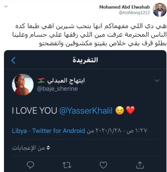 ونشر محمد عبر حسابه على "تويتر" تغريدة لشخصية تدعي أنها على علاقة بـ"شيرين"، ونشرت "منشوراً" قالت من خلاله، "بحبك" لـ"ياسر خليل" مدير أعمال شيرين السابق.