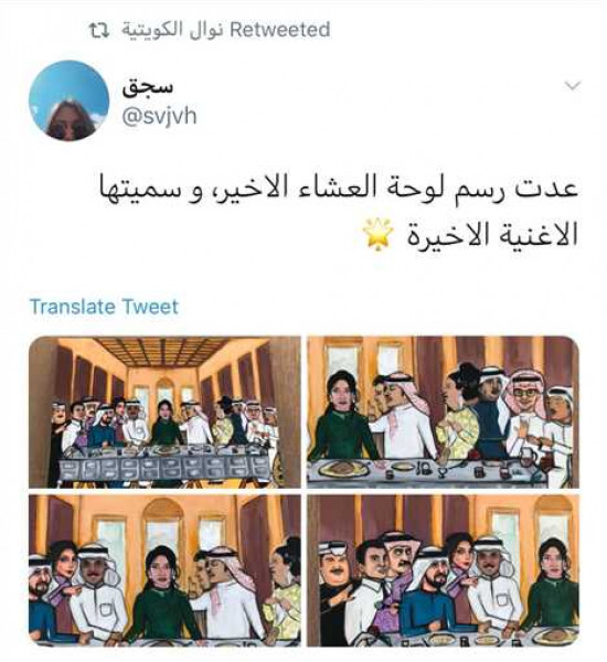 ولكون الصورة تجمع بين الفنانين كوكب الشرق أم كلثوم والعندليب الأسمر عبدالحليم حافظ، ونبيل شعيل، وعبدالله الرويشد، ورابح صقر، وأحلام، وآخرين، وعلقت الفتاة بقولها: "أعدت رسم لوحة العشاء الأخير، وسميتها الأغنية الأخيرة".
