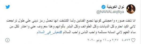 وكتبت نوال في اعتذارها: "أنا شفت صورة وأعجبتني كونها تجمع الفنانين، ولما اكتشفت إنها تحمل رمزًا دينيًا على طول تراجعت لأني أكيد أحترم كل الديانات وكل الطوائف وكل البشر بألوانهم".