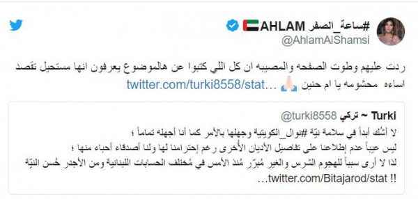 لكن الهجوم استمر على نوال الكويتية، ما دعا الفنانة الإماراتية أحلام إلى الدخول على الخط، فكتبت: "ردت عليهم وطوت الصفحة والمصيبة إن كل اللي كتبوا عن هالموضوع يعرفون إنها مستحيل تقصد إساءة.. محشومه يا أم حنين".