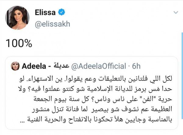 وكانت إليسا أيضاً قد انتقدت هذه اللوحة التي تحمل عنوان "العشاء الأخير"، وأعادت تغريد منشور لصفحة "عديلة الللبنانية"، وأوضحت أنها تتفق مع جاء فيه بنسبة 100%، والذي جاء نصه: "لكل اللي فلتانين بالتعليقات وعم يقولوا وين الاستهزاء. لو حدا مَس برمز للديانة الإسلامية شو كنتو عملتوا فيه؟ ولا حرية الفن على ناس وناس؟ كل سنة بيوم الجمعة العظيمة عم نشوف شو بيصير لما فنانة تنزل منشور بالمناسبة وجايين هلأ تحكونا بالانفتاح والحرية الفنية".
