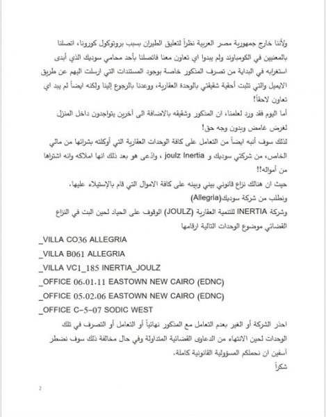 واختتمت: "أحذر الشركة أو الغير بعدم التعامل مع المذكور نهائيا أو التعامل أو التصرف في تلك الوحدات لحين الانتهاء من الدعاوى القضائية المتداولة وفي حال مخالفة ذلك سوف نضطر آسفين أن نحملكم المسؤولية القانونية الكاملة".