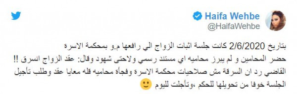 وغردت وهبي عبر حسابها بموقع "تويتر" قائلة: بتاريخ 2/6/2020 كانت جلسة اثبات الزواج الي رافعها م.و بمحكمة الاسرة حضر المحامين و لم يبرز محاميه أي مستند رسمي ولاحتى شهود وقال: عقد الزواج انسرق !!".