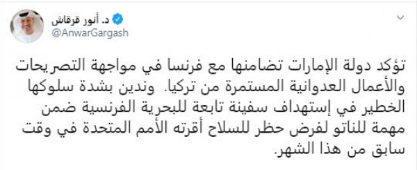 وأعرب قرقاش في تغريدة له عبر حسابه بموقع (تويتر)، عن إدانة الإمارات بشدة سلوك تركيا، الذي وصفه بـ"الخطير"، والمتمثل في "استهداف سفينة تابعة للبحرية الفرنسية، ضمن مهمة للناتو لفرض حظر للسلاح، أقرته الأمم المتحدة في وقت سابق من هذا الشهر".