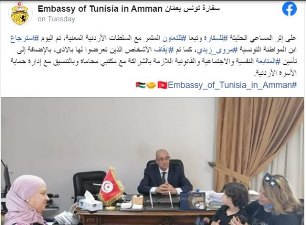 وقالت السفارة التونسية في العاصمة عمان، على صفحتها في موقع "فيسبوك"، إنها تمكنت من حل قضية التونسية المعنفة، مروى زيدي، بالتعاون مع السلطات الأردنية المعنية بحسب مانقلت "روسيا اليوم".