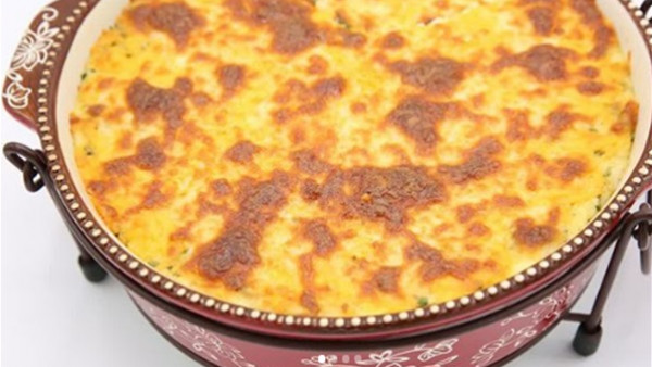 -ضعي الطبق في الفرن 20 دقيقة أو إلى أن يصبح ذهبي اللون. قدميه دافئا.