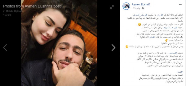 كذلك، قرر الصديق المقرب للمقريف، أن يكشف الحقيقة بحسب وجهة نظره، فكتب أيمن الشريف عبر فيسبوك: "الكلام إللي قالته الكويتيه روان عن طليقها يوسف المقريف لأنه راجل معروف و مشهور في السوق العقارات يبوا يديروله تشويه سُمعة لكن صعب عليهم سواء روان أو البيادق من العرب".