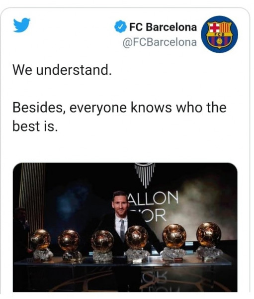 وبعد ذلك، رد الحساب الرسمي لنادي برشلونة على موقع (تويتر): "نحن نتفهم.. إلى جانب ذلك، الجميع يعرف من هو الأفضل" وتم إرفاق صورة الأرجنتيني ليونيل ميسي، مع الكرات الذهبية التي حصل عليها.