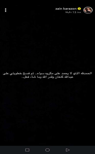 وكتبت زين عبر حسابها الرسمي على تطبيق "سناب شات": "الحمد الله الذي لا يحمد على مكروه سواه.. تم فسخ خطوبتي على عبدالله كنعان.. وقدر الله وما شاء فعل".