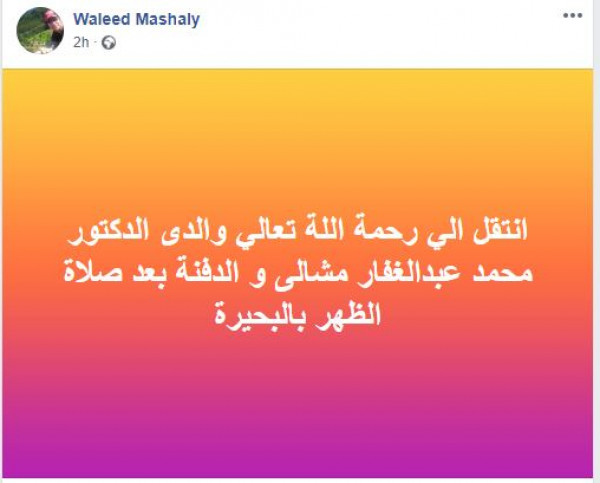 وكتب وليد عبر صفحته الخاصة على "فيسبوك": "انتقل الي رحمة الله تعالي والدي الدكتور محمد عبدالغفار مشالي والدفنة بعد صلاة الظهر بالبحيرة".
