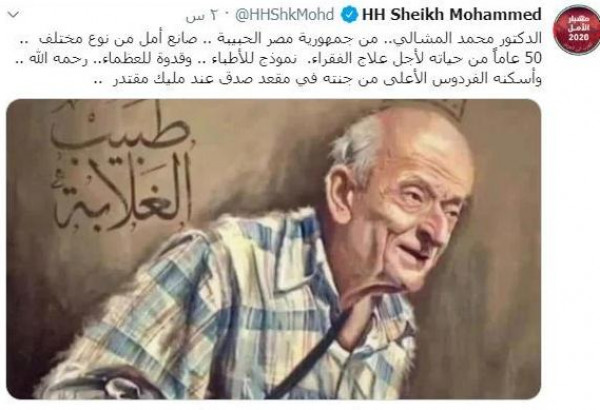 نعى حاكم إمارة دبى، محمد بن راشد،طبيب الغلابة محمد مشالي الذى وافته المنية اليوم.