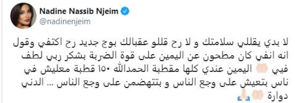 وأضافت نادين نجيم: "معلهش، هناك ناس تعيش على وجع الناس وبتتهضمن على وجع الناس.. الدنيا دوارة".