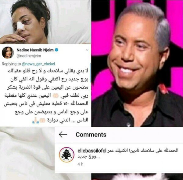 ردت النجمة اللبنانية، نادين نسيب نجيم، على تهكم المدون والصحفي إيلي باسيل، منها بعد خضوعها لعملية في وجهها إثر انفجار مرفأ بيروت.