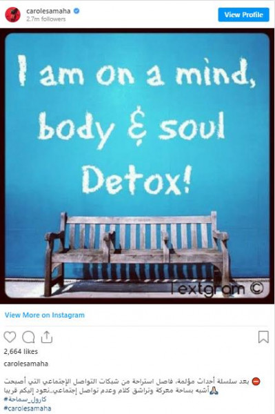 وقال كارول سماحة: "بعد سلسلة أحداث مؤلمة، فاصل استراحة من شبكات التواصل الاجتماعي".