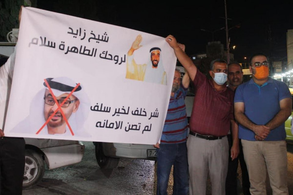 وخلال الوقفة احرق المشاركون صور ولي عهد الإمارات محمد بن زايد، ونتنياهو، والرئيس الأمريكي ترامب، واصفين هذا الاتفاق بالمؤامرة على تستهدف تكريس الضم و الاحتلال، والقدس عاصمة لإسرائيل.