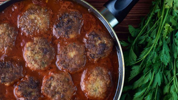 4- صفي الكفتة في صينية فرن مدهونة بالقليل من الزيت ثم وزعي على وجهها عصير الطماطم.