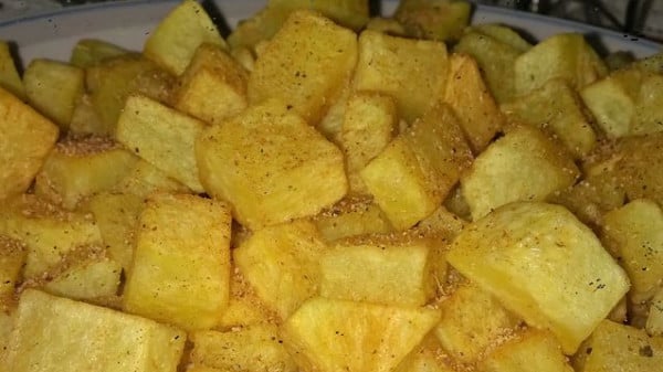 2- نكّهي بالملح والبابريكا ثم اتركي البطاطس حتى تنسلق نصف سلقة.