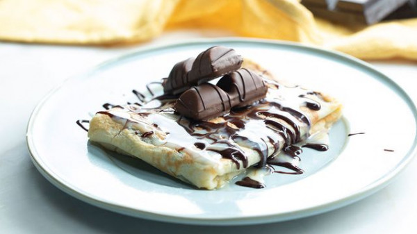 3- إرفعي الكريب من المقلاة وادهنيها مبشارةً بشوكولاتة نوتيلا ثمّ أضيفي قطع من شوكولاتة بوينو. اغلقيها وأضيفي على الوجه الشوكولاتة بالحليب والشوكولاتة البيضاء. مرري عوداً خشبياً على الشوكولاتة حتى تحصلي على الشكل المرغوب به.