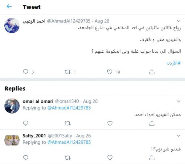 أثار مقطع فيديو متداول عبر مواقع التواصل الاجتماعي يرصد حفل زفاف لفتاتين أردنيتين مثليتين جدلا واسعا في الأردن، وسط مطالبات بالتحقيق واتخاذ الإجراءات اللازمة.
