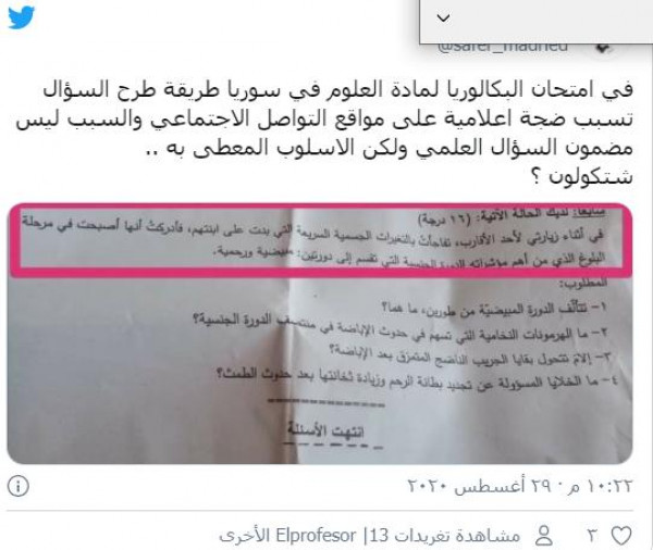 أثار امتحان مادة العلوم في سوريا، جدلاً بين الناشطين عبر مواقع التواصل الاجتماعي بسبب سؤال خادش للحياء لطلاب الصف الثالث ثانوي العلمي، والذي جرى أمس السبت.