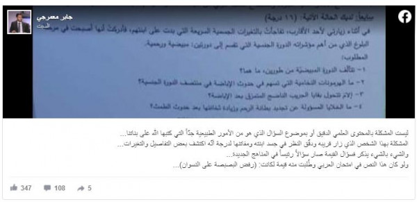وهذا الذي أكده الأكاديمي السوري جابر معمرجي، والذي كتب عبر صفحته على (فيسبوك): "ليست المشكلة بالمحتوى العلمي الدقيق أو بموضوع السؤال الذي هو من الأمور الطبيعية جدّاً".