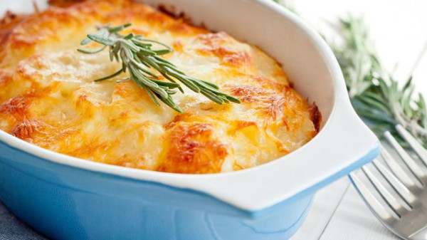 8- وزعي خليط الدجاج في صينية فرن ثم ضعي طبقة من البطاطس. أسكبي صلصة البشاميل على وجه الصينية ثم انثري جبن الموزاريلا.