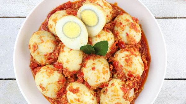 3- قطّعي البيض المسلوق الى نصفين وأضيفيها إلى الخليط السابق. عندما يغلي المزيج أطفئي النار.