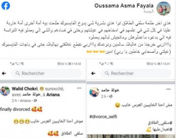 تداول رواد مواقع التواصل الإجتماعي في تونس صورة "سيلفي" لشابين تونسيين من إحتفالهما بطلاقهما.