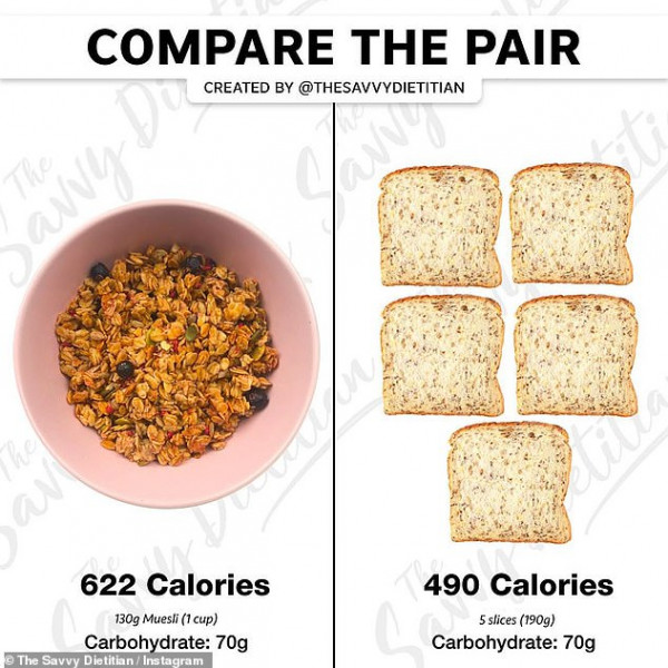 وبحسب الخبيرة، فإن قطعة من الخبز تحتوي على 70 غراماً من الكربوهيدرات، وعلى 490 سعرة حرارية في حين أن نفس الكمية من وجبة الموسلي التي يتناولها الكثيرون عوضاً عن الخبز تحتوي على 622 سعرة حرارية.