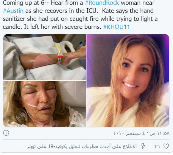 صور: امرأة تصاب بحروق شديدة بعد اشتعال النيران في جلدها بسبب معقم اليدين